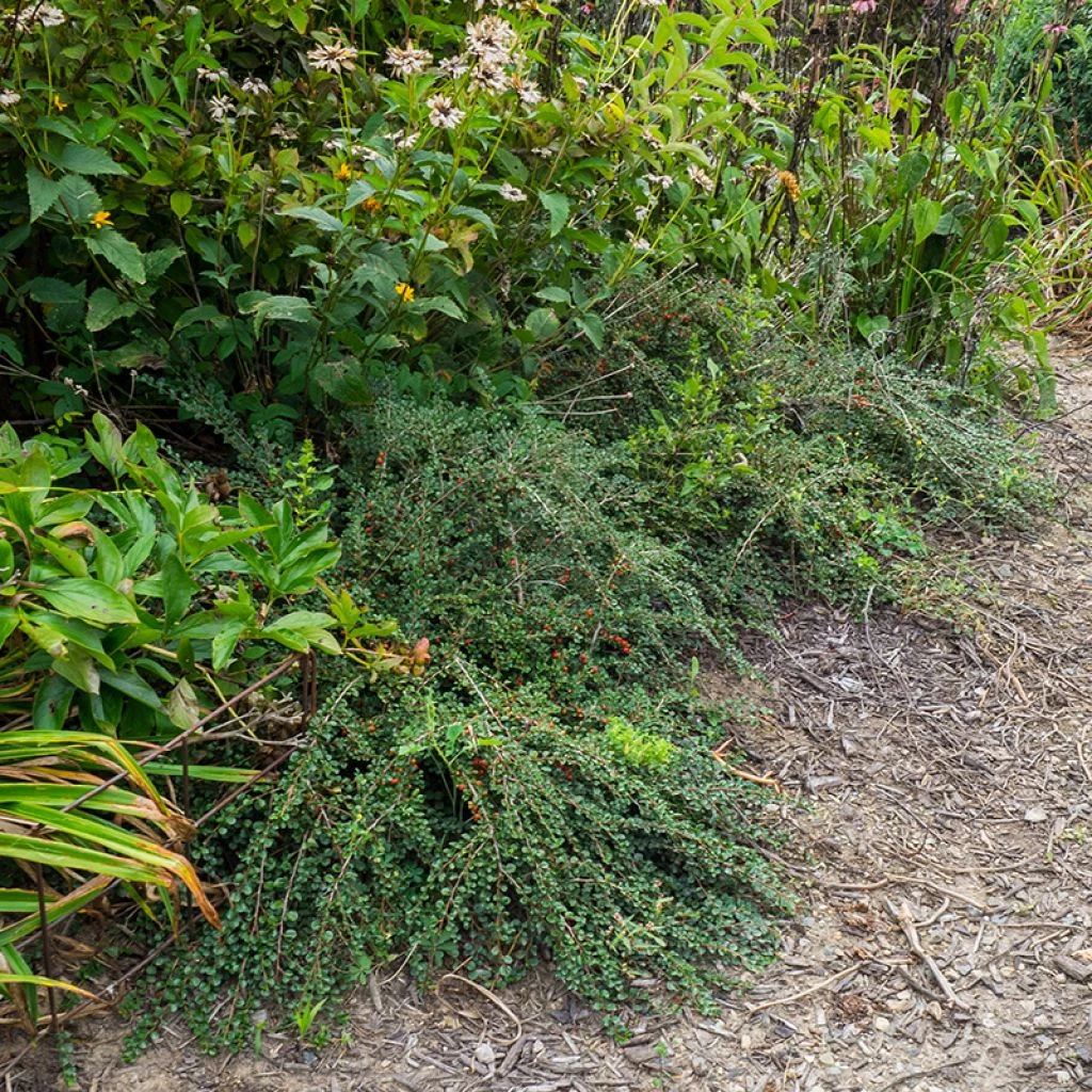Le Cotoneaster praecox appartient à la grande famille des Rosacées et est originaire de l’ouest de la Chine. Très robuste, il est capable de résister aux hivers très rudes et aux sécheresses ponctuelles, même lorsqu’il pousse dans un sol maigre et pierreux. Le cultivar ‘Boer’ montre un port prostré, étalé et rampant, soutenu par des rameaux courbes et souples, irrégulièrement ramifiés, de couleur brun-rougeâtre. Sa croissance est assez rapide, il atteindra à maturité environ 60 cm de hauteur pour 3 m d’envergure. Son feuillage caduc est composé de très petites feuilles épaisses et coriaces, de forme ovale. Elles sont d’un vert assez foncé, et rougissent en automne avant de tomber. La floraison a lieu en avril-mai, de toutes petites fleurs à 5 pétales blancs teintés de rose. Mellifères, elles laissent place à des fruits charnus de 5 à 7 mm de diamètre, dès le mois d’août. D’un rouge vif, ils sont très appréciés des oiseaux.
